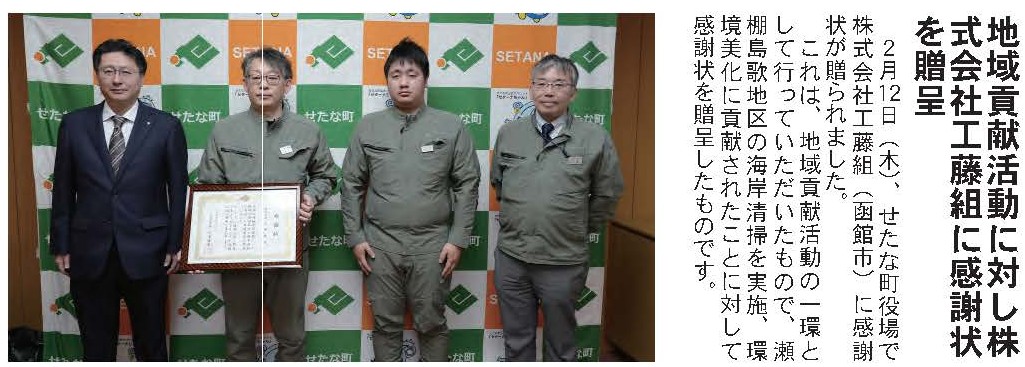 この度、当社が施工している「一般国道229号 せたな町 虻羅トンネル補修外一連工事」において、かねてより地元の方々からの要望があった島歌地区の海岸清掃活動を実施したことが地域貢献として高く評価され、せたな町長より感謝状をいただき「広報せたな」に掲載されました。